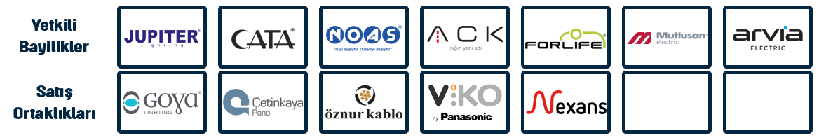 Resmi bayi güvencesiyle; Cata, Jüpiter ve Noas ile modern LED aydınlatma; Forlife ve Arvia ile dekoratif çözümler; Mutlusan ve Çetinkaya Pano ile profesyonel elektrik altyapı malzemelerini en avantajlı fiyatlarla sunuyoruz.